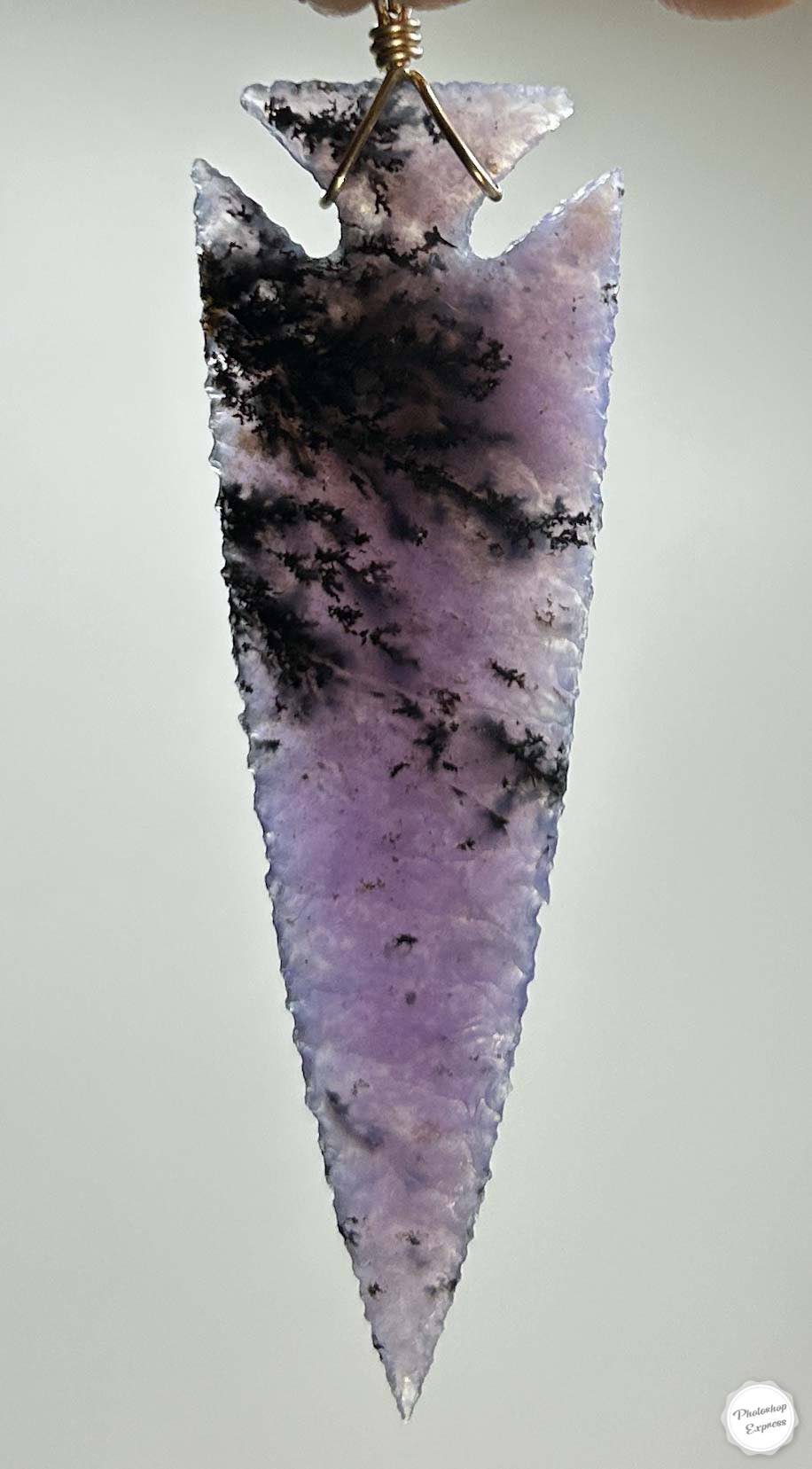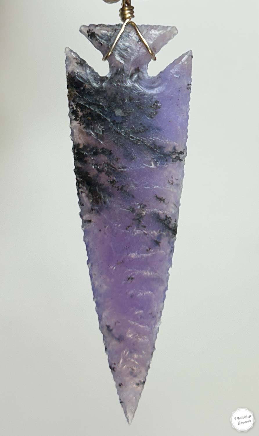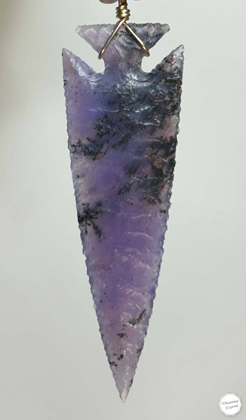 The 2.4″ arrowhead necklace is knapped from an unusual material called Amethyst Sage. It was found in Nevada and has a variation of colors and things occurring within, including lots of dendrites. This has gorgeous pattern and is saturated with amethyst color to be true to its namesake.