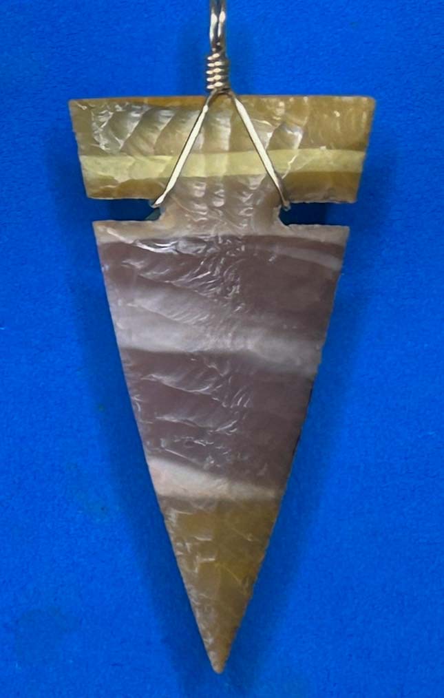Mookite is a rock unlike anything else. It’s actually petrified mud formed eons ago in the Australian Outback and the high grade material knaps very well. The pattern in this 2″ arrowhead necklace is rather exceptional and will certainly never be duplicated. It’s wire wrapped with 14K gold wire.