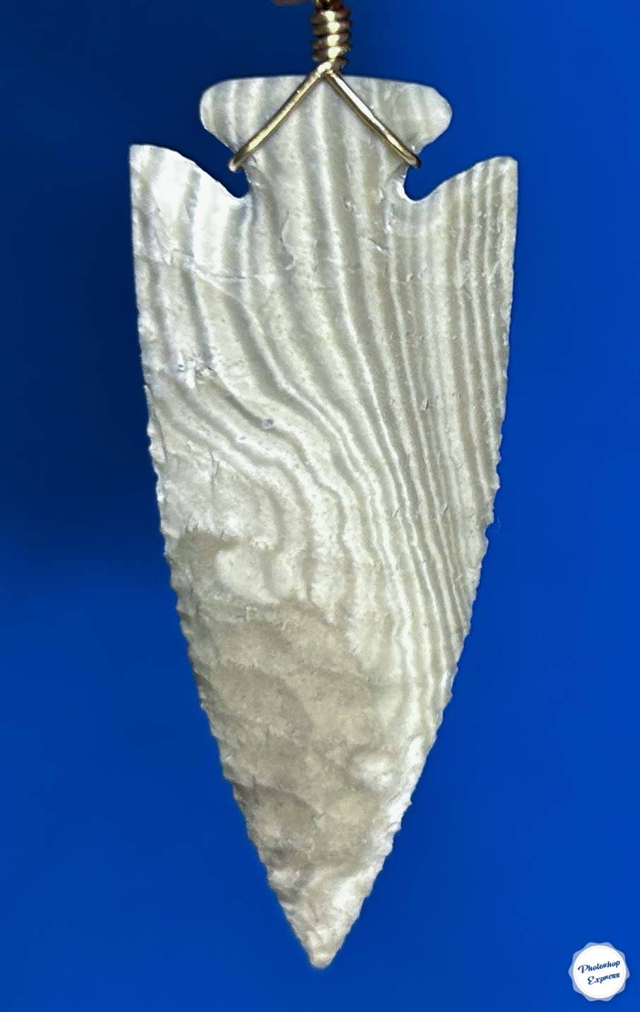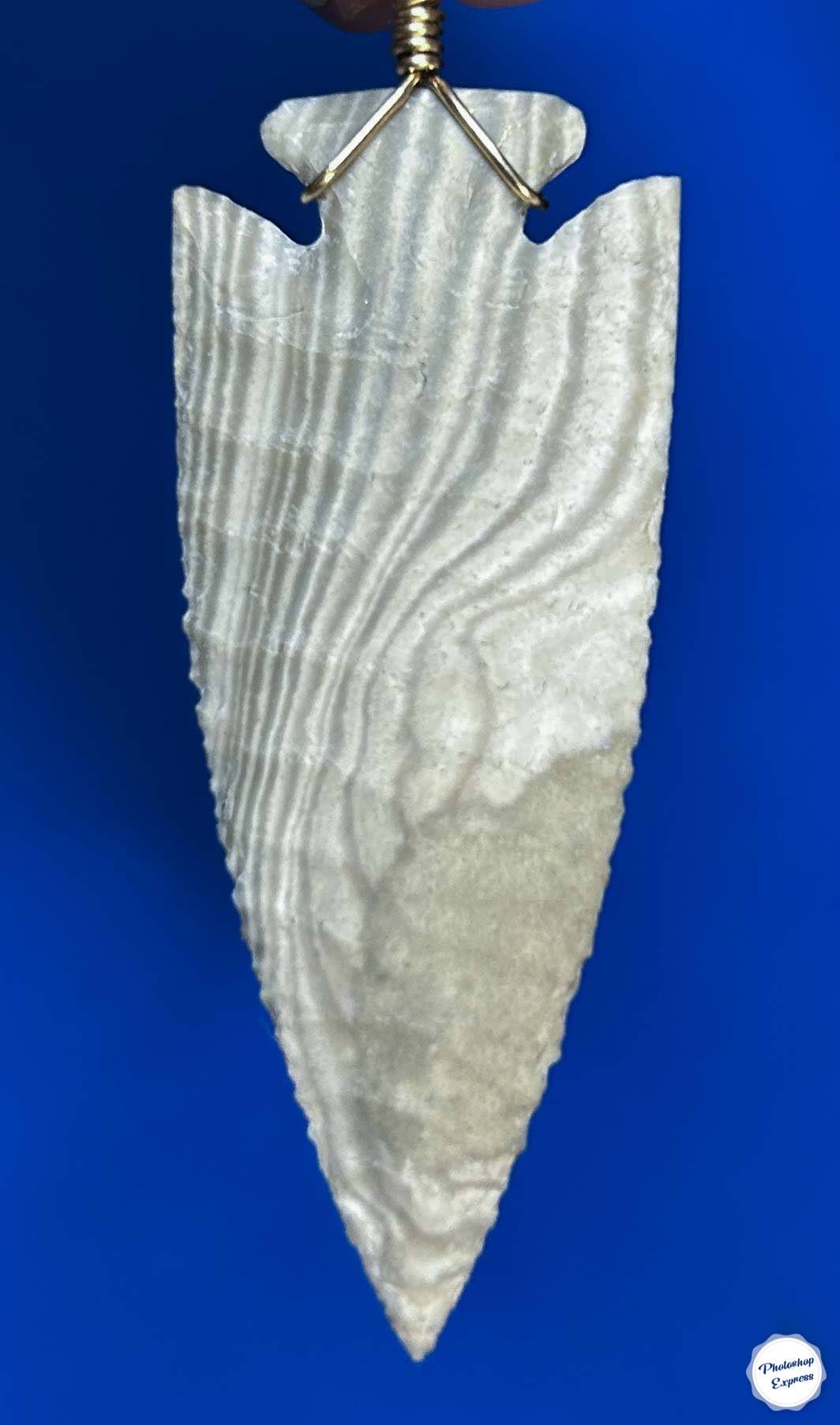 This 2″ arrowhead necklace is knapped from a striking piece of Texas flint. It’s a scarce material and it took some time and work to get even a small amount, but when it becomes a necklace piece like this, it makes me want to go for it! This bail on this point is 14k gold filled wire and it comes with a gold plated 18″ chain. There’s no arrowhead necklace like this one in any jewelry store!