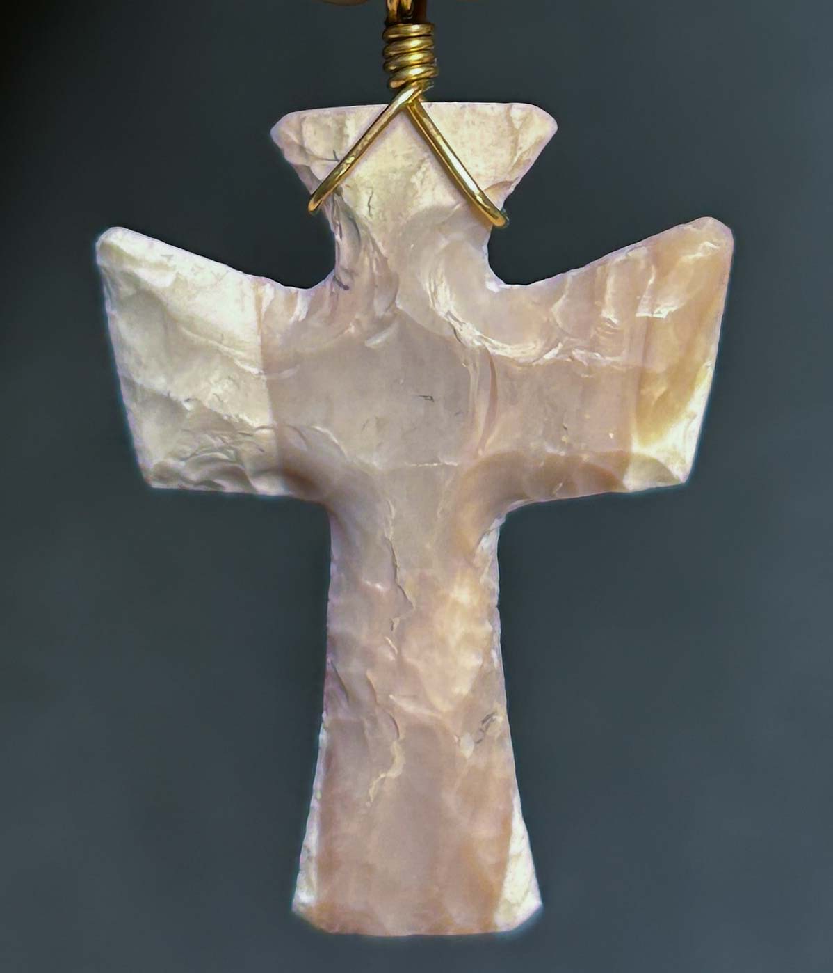 This is a cross necklace flintknapped from a premium piece of Australian Mookite, which is actually ancient petrified mud. It measures 1 inch by 3/4 inch and its unique beauty is complimented with a 14k gold filled wire bale. 18″ gold plated chain is included.