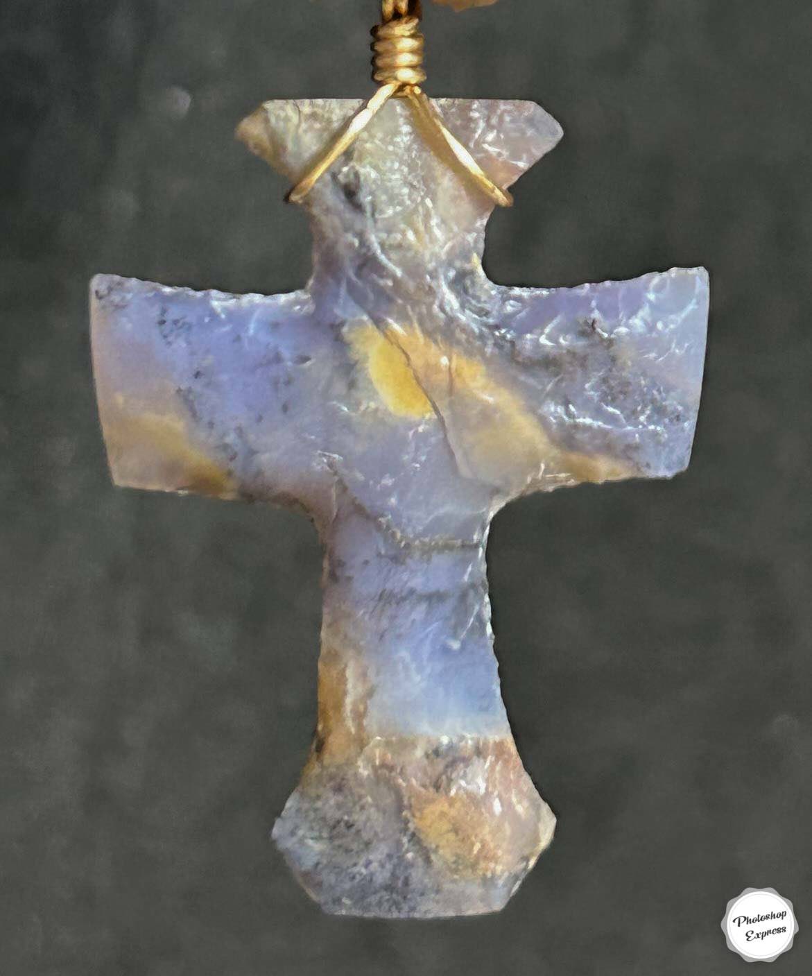 Amethyst Sage is a hard to get material from the Bilk Mountains in Nevada. The purple hues within it are punctuated with tiny black dendrites and cream-colored flares, plus the added virtue of semi-translucency. This unique flintknapped cross measures 1.4″ x 1.2″, the wrap and bail being 14k gold filled wire. It comes with an 18″ gold plated chain.