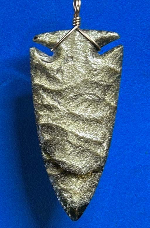 Gold Sheen Obsidian from Mexico is a material that I’m always on the hunt for. It’s another material which has gotten harder to find, but is worth the effort. Its golden, flashing chatoyance is something to behold, and this 2″ flintknapped arrowhead necklace is a beautiful example!  It’s certainly deserving the 14k gold filled wire bale!  Comes with 18″ gold plated chain.