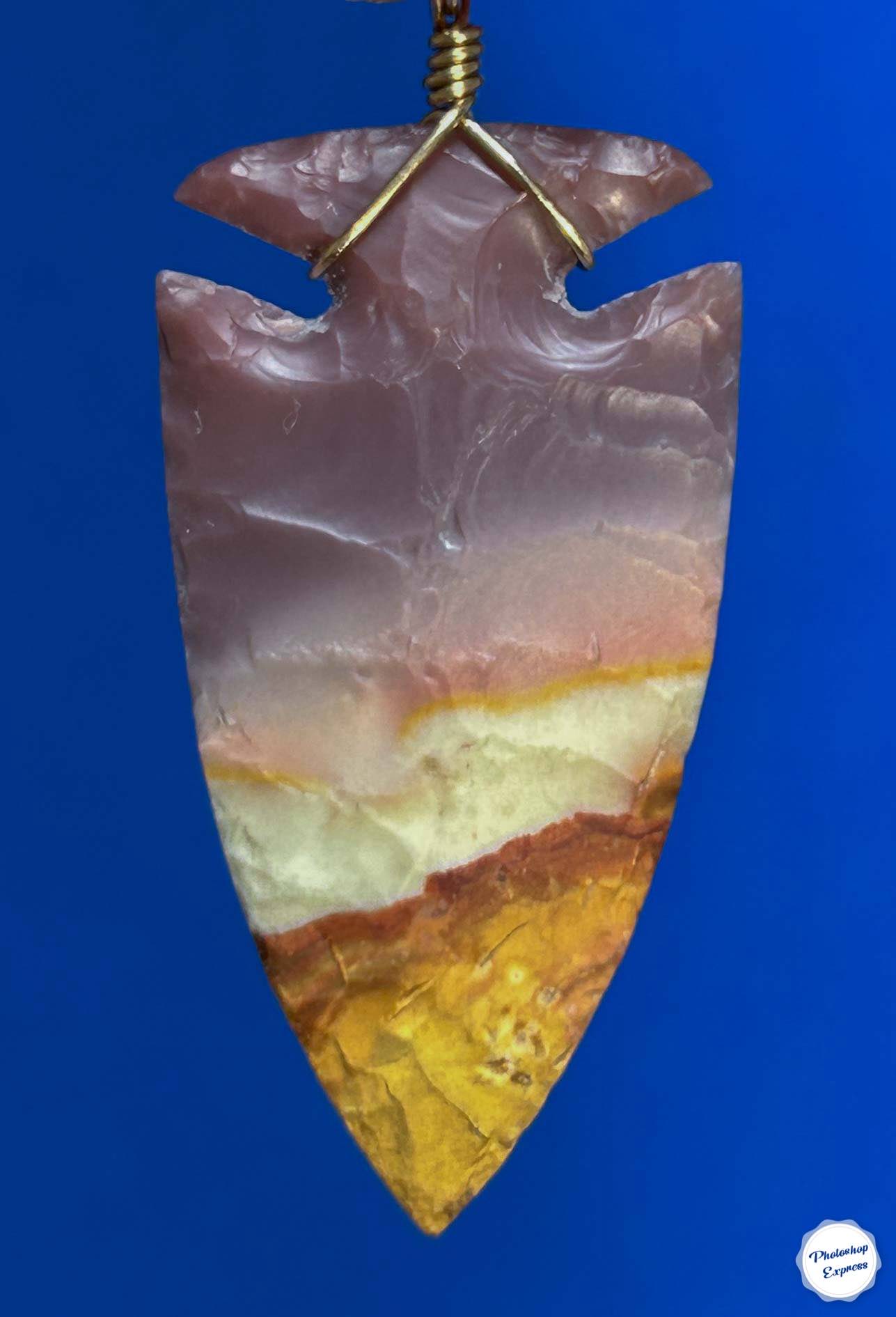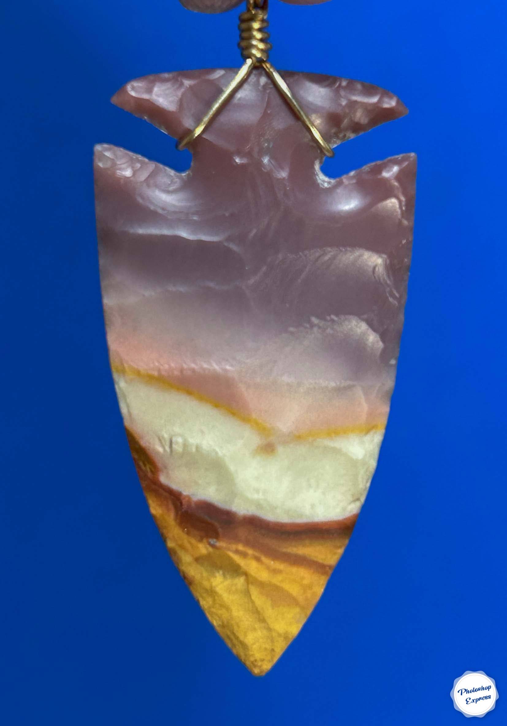 This flintknapped arrowhead necklace is made of Polychrome Jasper from Madagascar and is some of the most gorgeous rock I have ever knapped. This one measures 1.4″, has a 14k gold-filled wire bail, and comes with an 18″ gold plated chain. Is there another like it? no, and it’s very unlikely there ever will be one exactly like it.