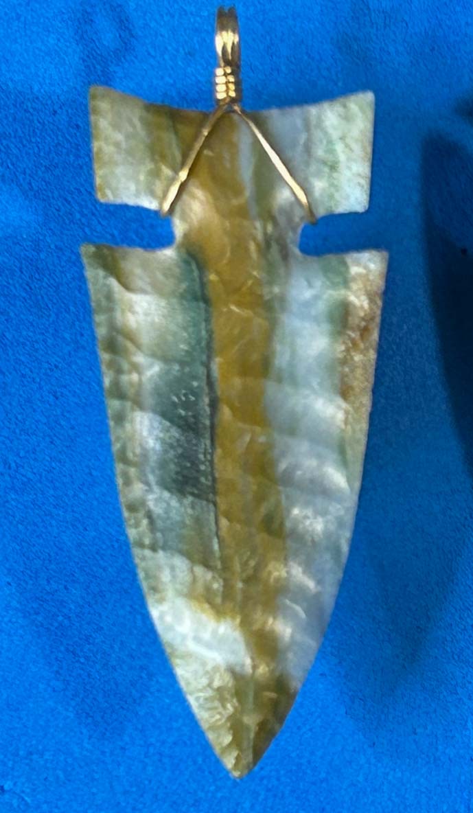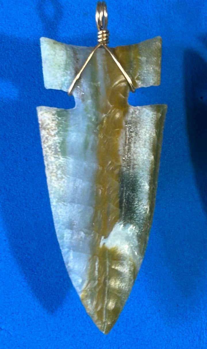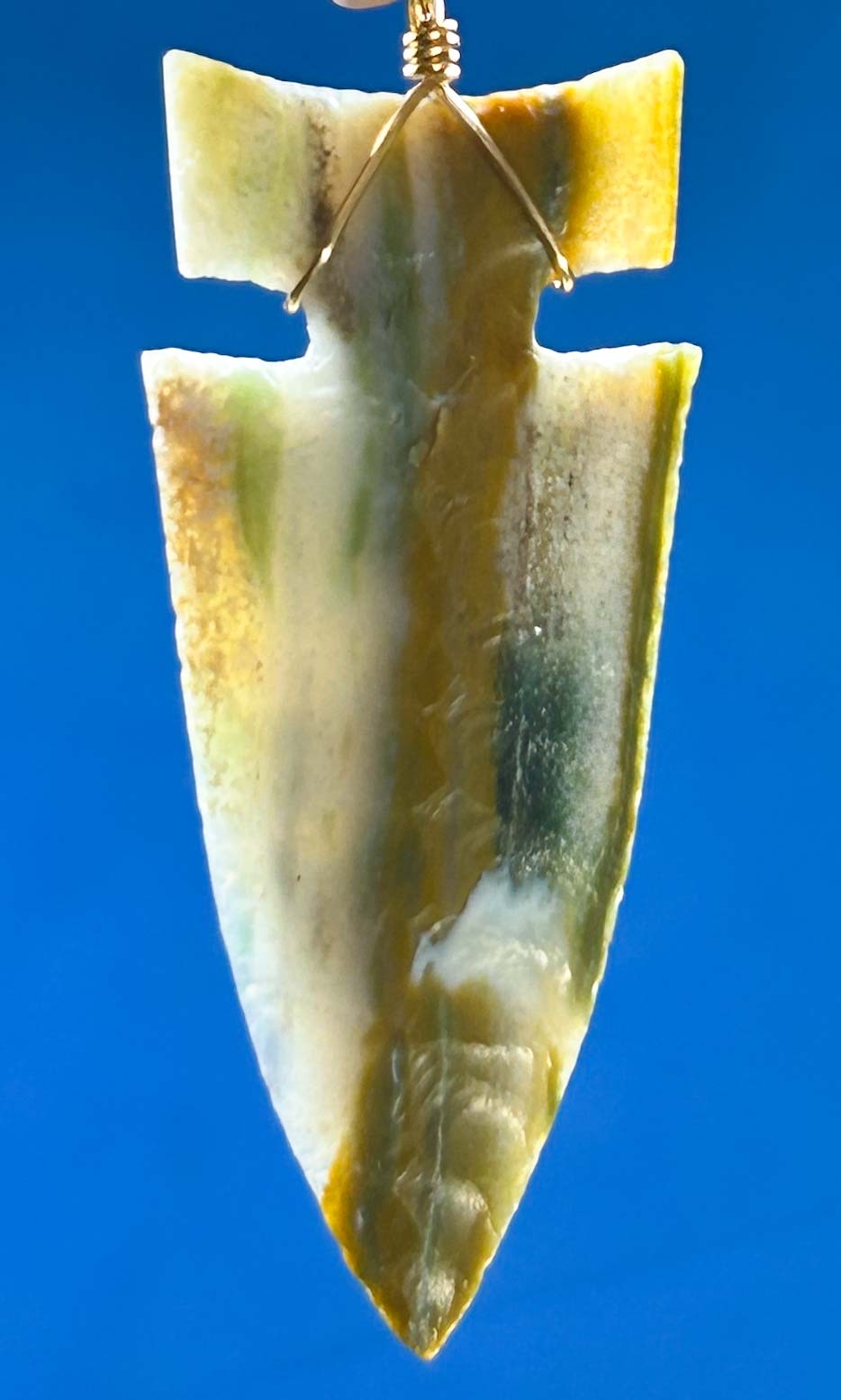 This 2.25″ arrowhead necklace has something special. The stone comes from the wilds of Madagascar. It’s a very rare material that hasn’t been available in many years, but even more than that, this arrowhead has some wild and gorgeous translucency. This prehistoric point type was made in Northwest America and was called a Northern Sidenotch. It’s special and elegance is it’s middle name. The bale is 14K gold wire.