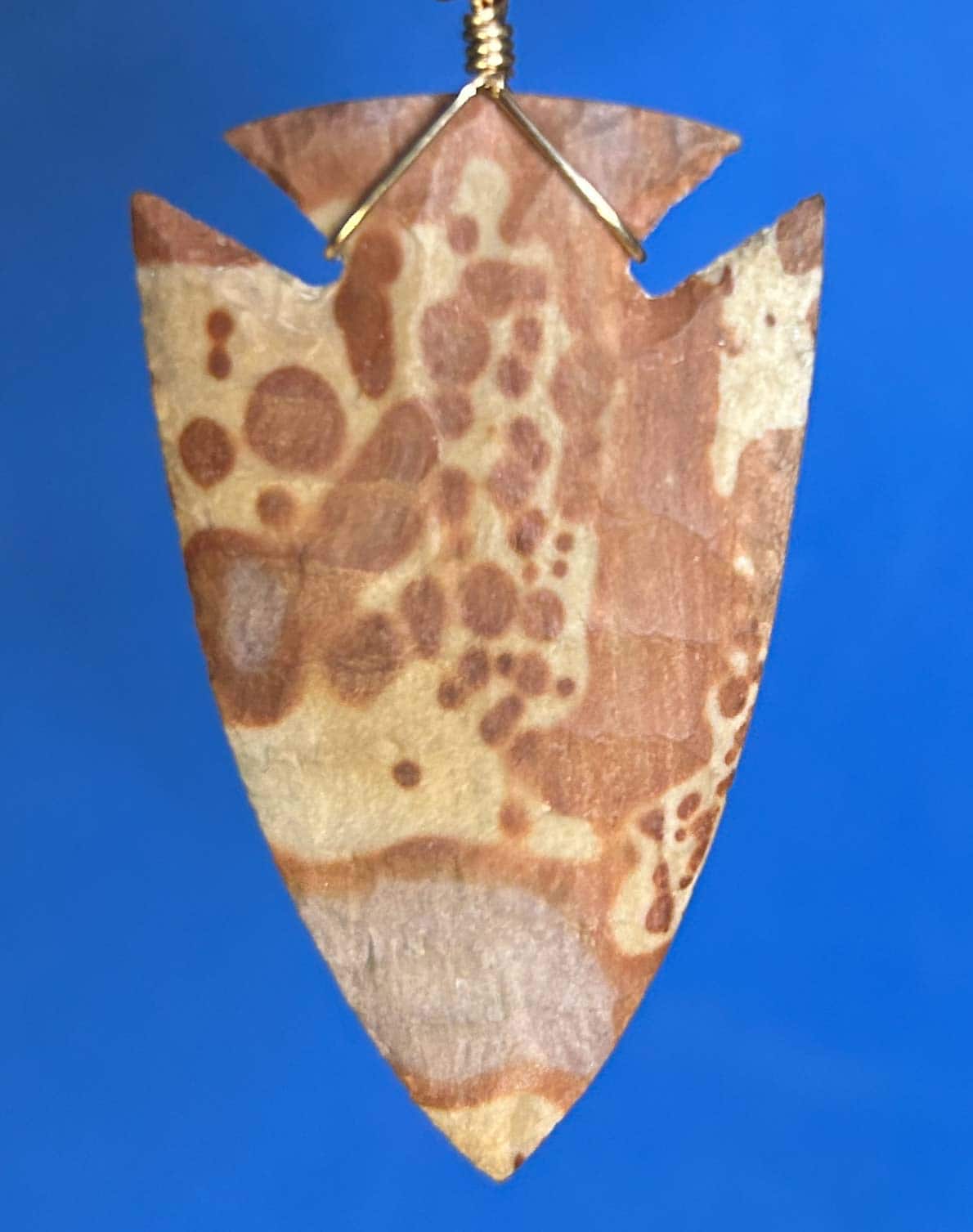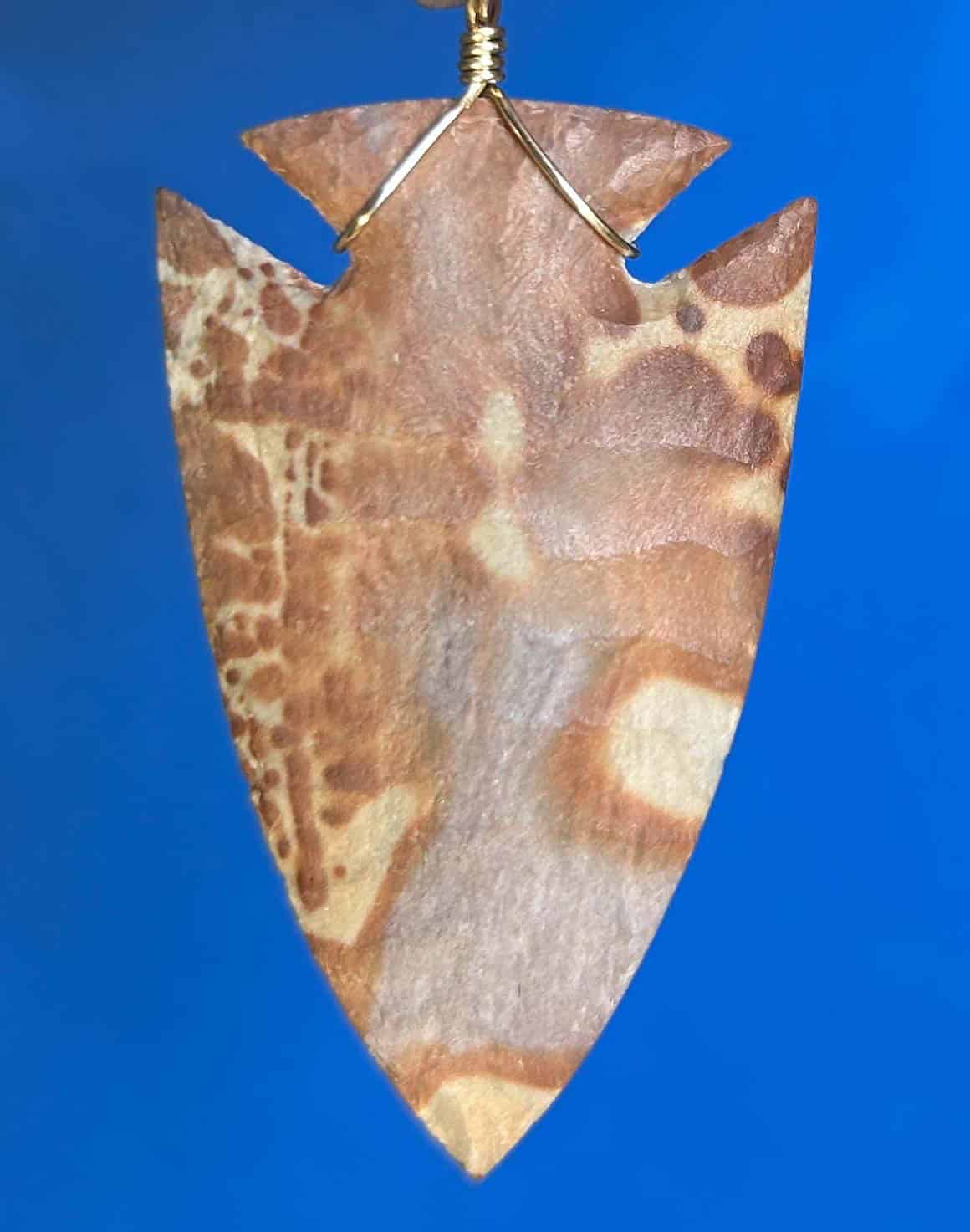 Here’s a 2″ x 1.25″ flintknapped arrowhead necklace made of Painted Buffalo River Chert. It’s a material from Tennessee that’s as beautiful as it is unusual. This one has been in detention for a while so I could enjoy looking at it, but it’s time for it to find a permanent home. It’s adorned with 14k gold filled wire wrap and comes with an 18″ gold plated chain.