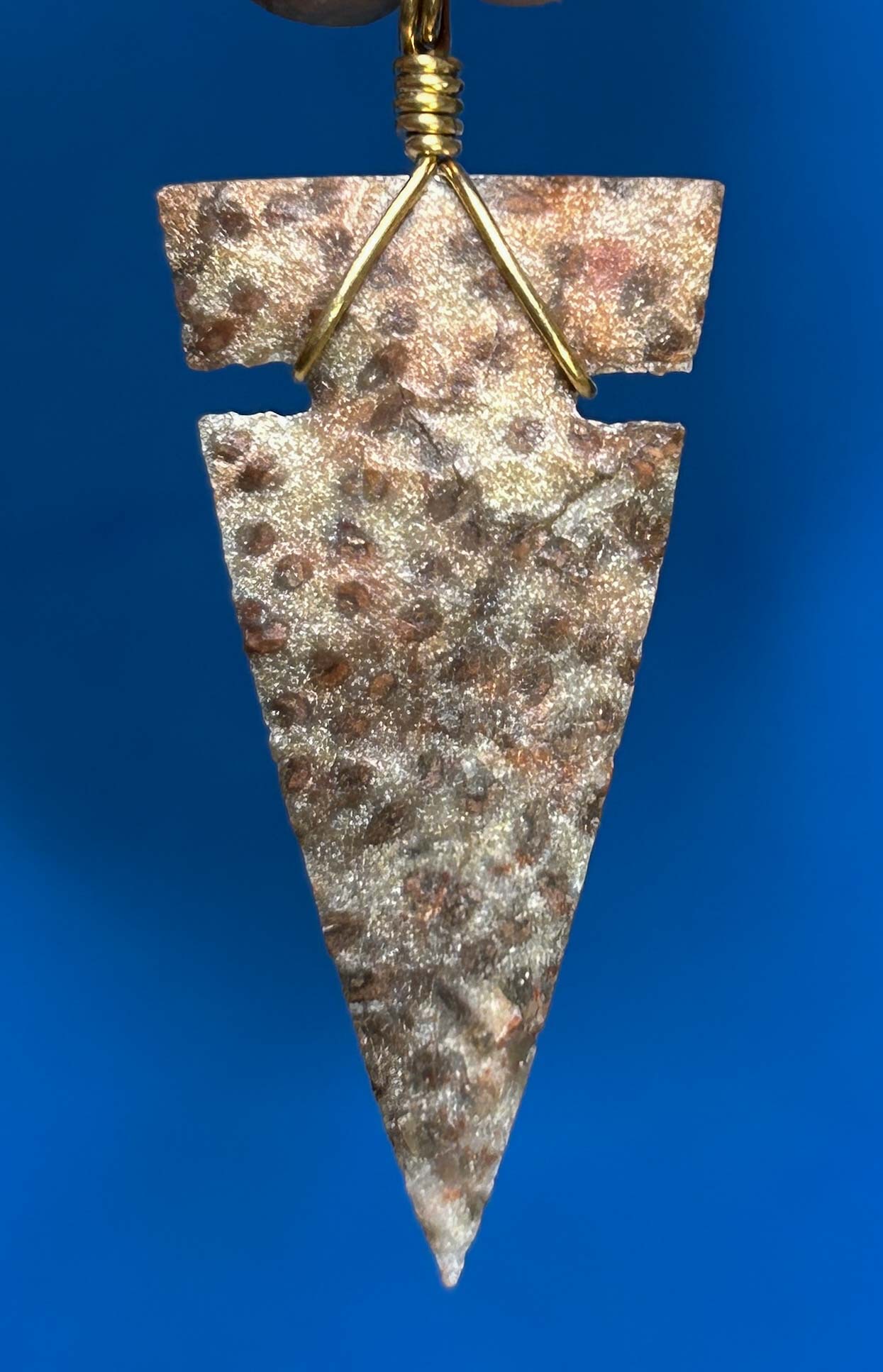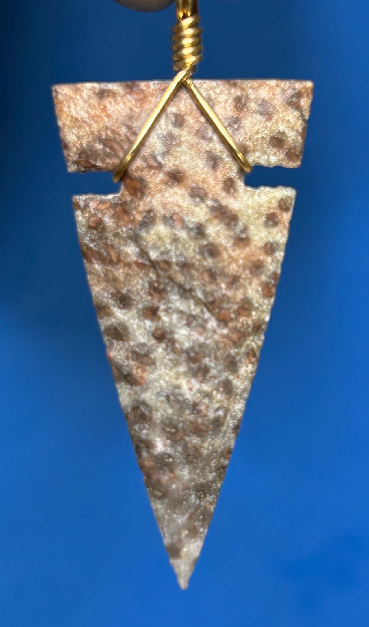 Petrified Palmwood is one of my favorite knapping materials and this is one of my favorite arrowhead necklaces. This one is 2.25″ of wood, turned to stone, turned to beautiful jewelry. The bail is 14k gold filled wire and an 18″ gold plated chain is also included.
