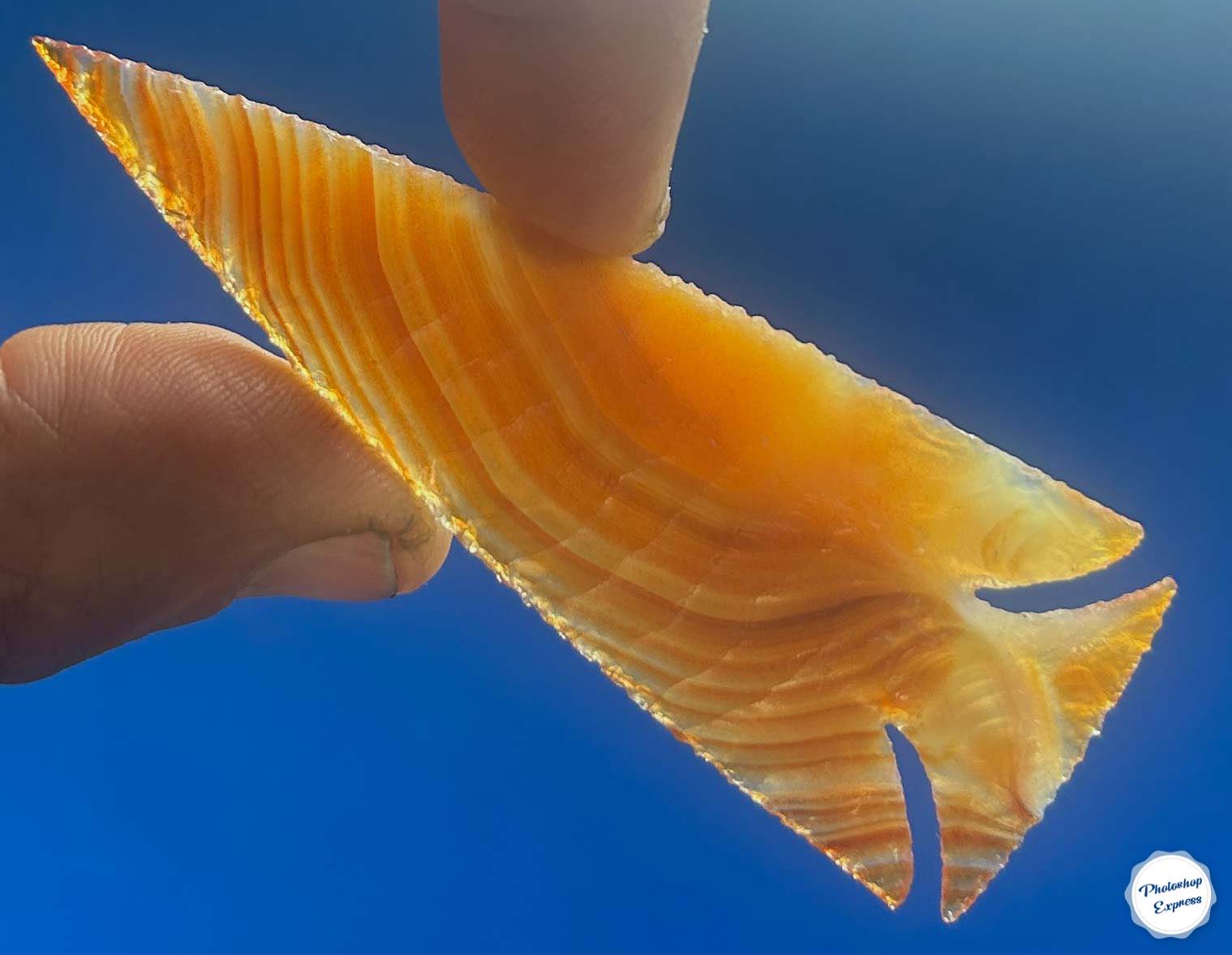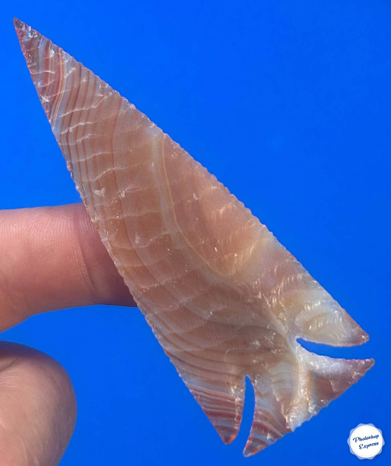 This 3.5″ Brazilian Agate point is what I call an extreme notched arrowhead. The notches are not only deep but also tapered and gently curved. Did prehistoric people make notches this narrow? Rarely if ever, but that doesn’t mean a modern flintknapper can’t push the limits. The material is also beautifully banded and I call it a Keeper!