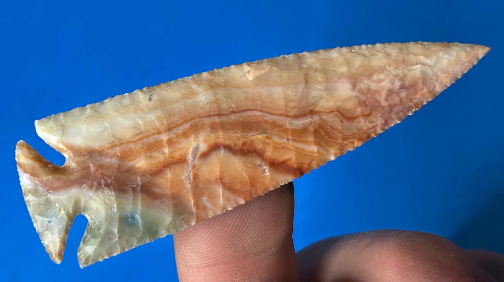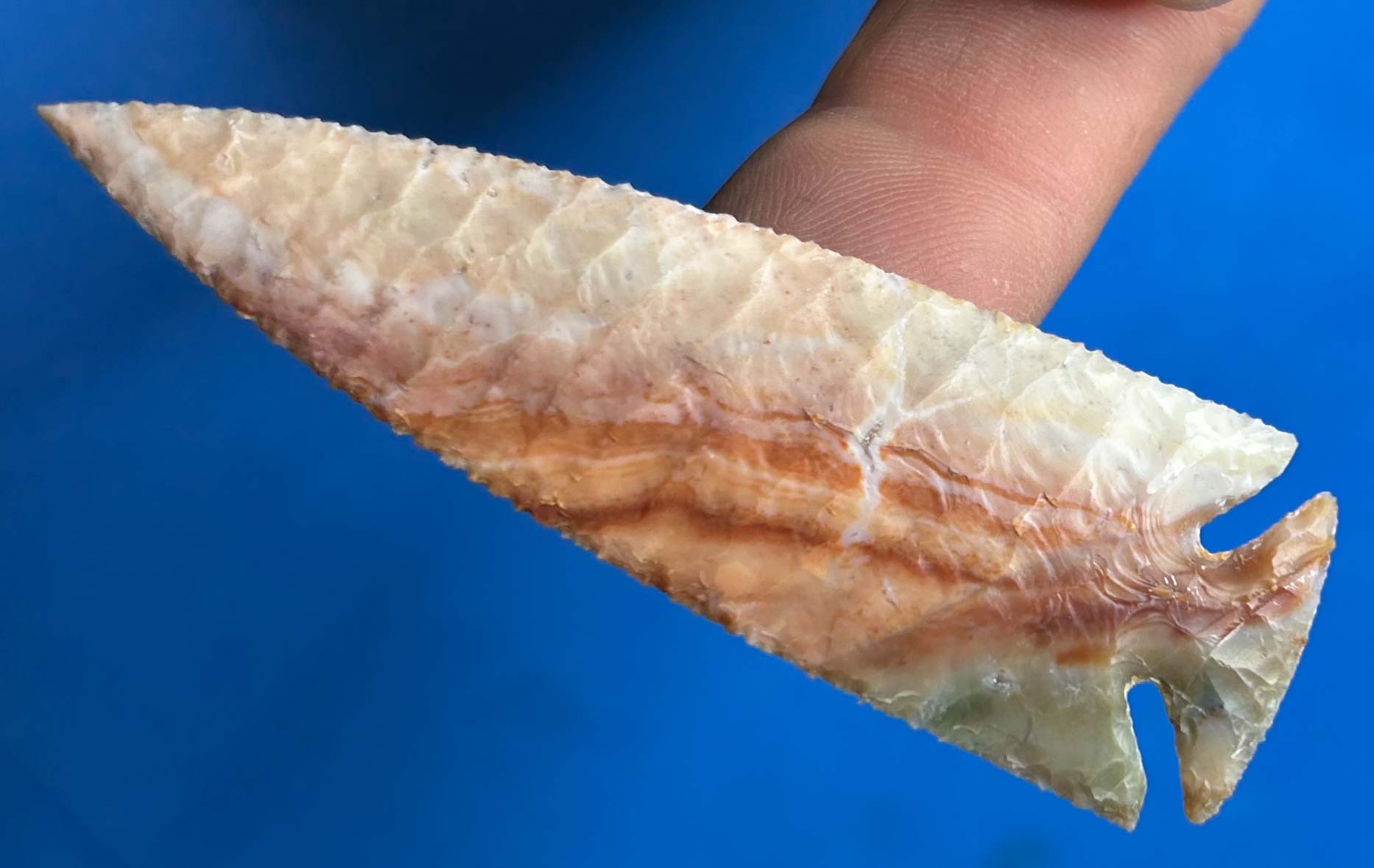 Flint Ridge is one of those materials that has been celebrated for thousands of years, by prehistoric people of North America and now by modern flintknappers. It’s unique beauty has always been recognizable by those who know fine lithic materials. I think this unique 3.25″ Corner Notch point would have been a desirable piece to those people who hunted and lived in the central Ohio area and throughout the Midwest.  This is what I call a classic piece of Flint Ridge!