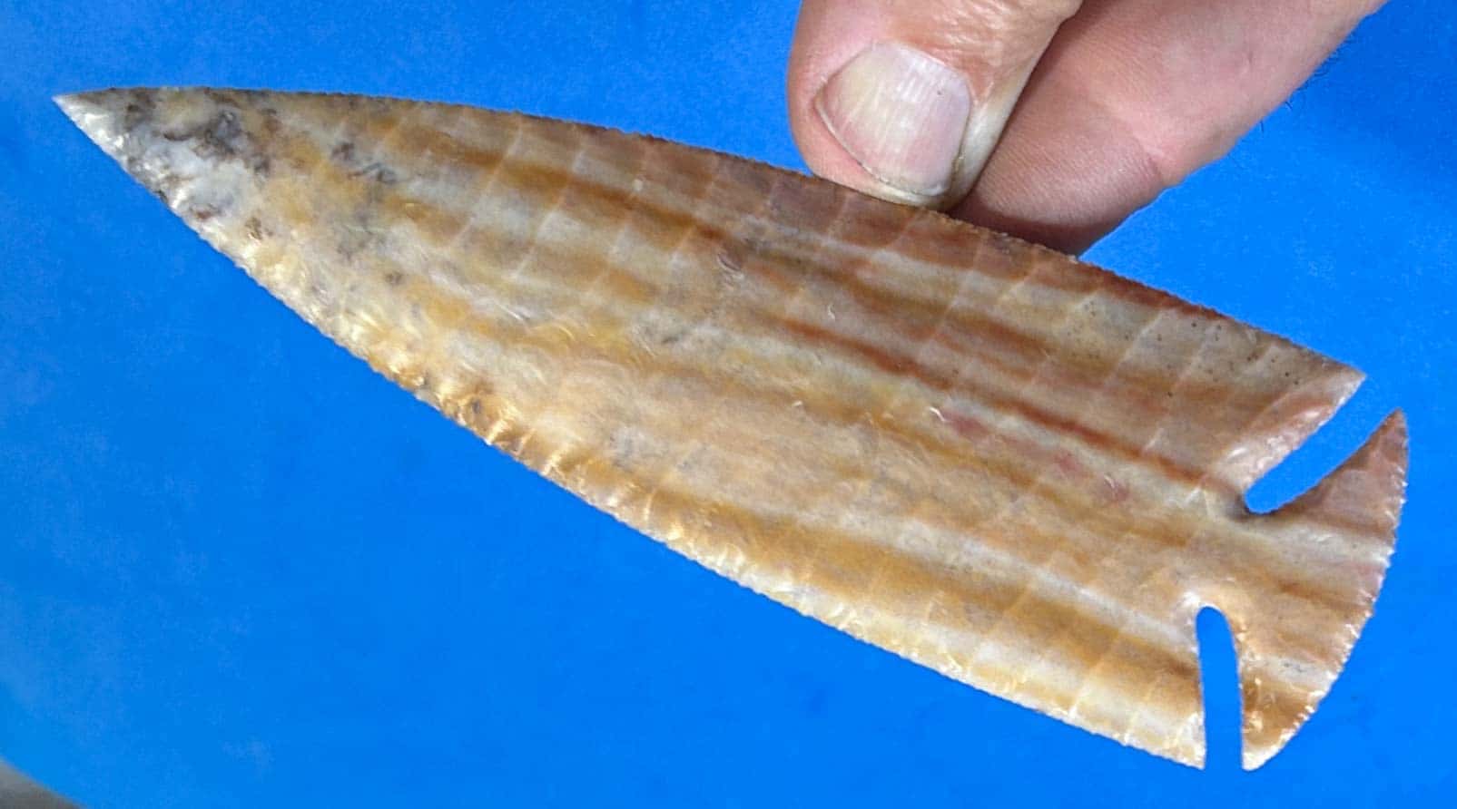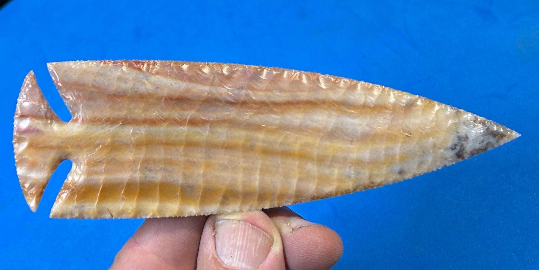 This 5.75″ x 1.75″ Flint Ridge deep notched Dovetail is knapped from some Flint Ridge flint from Ohio. I could rant and rave about it’s beautiful color, deep notches, and how well it turned out, but I’ll just let you ogle it and see if you don’t agree! Enjoy!