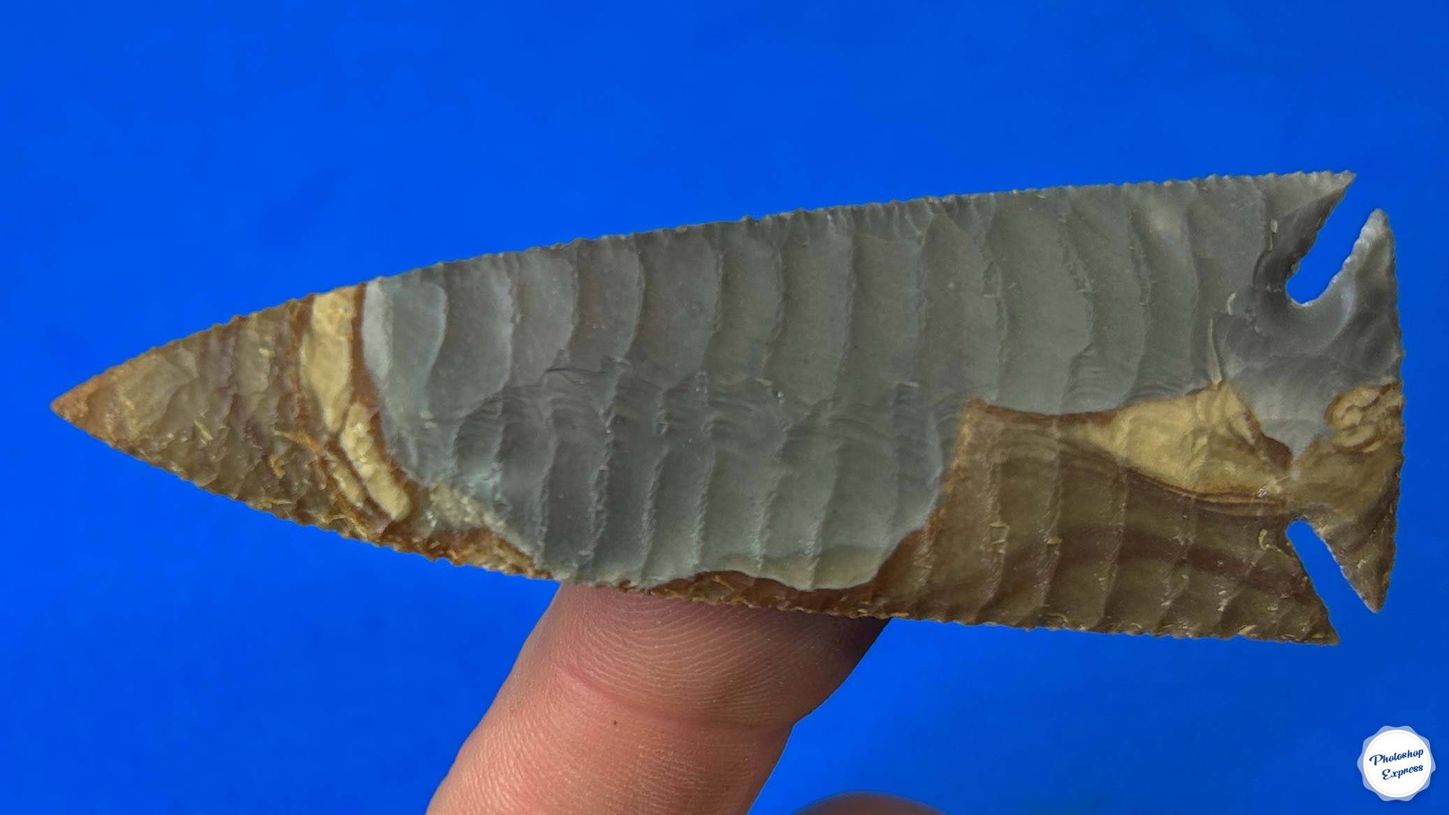 The seeming landscape in this 3.5″ Polychrome Jasper arrowhead is an amazing piece of natural beauty. A friend accused me of taking a photo of a scenic lanscape and printing it on an arrowhead. It was funny, but knapping this point was a long ways from being that simple! In any case, an image like this hiding within a rock from Madagascar is certainly a wonder!
