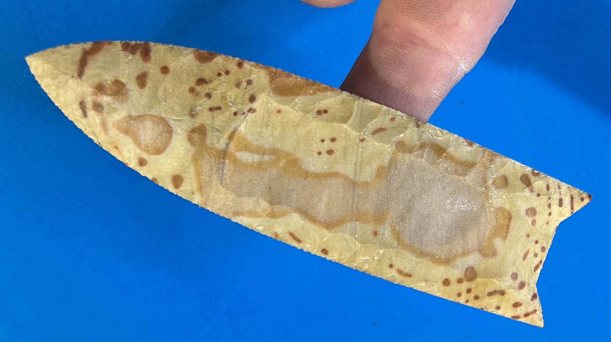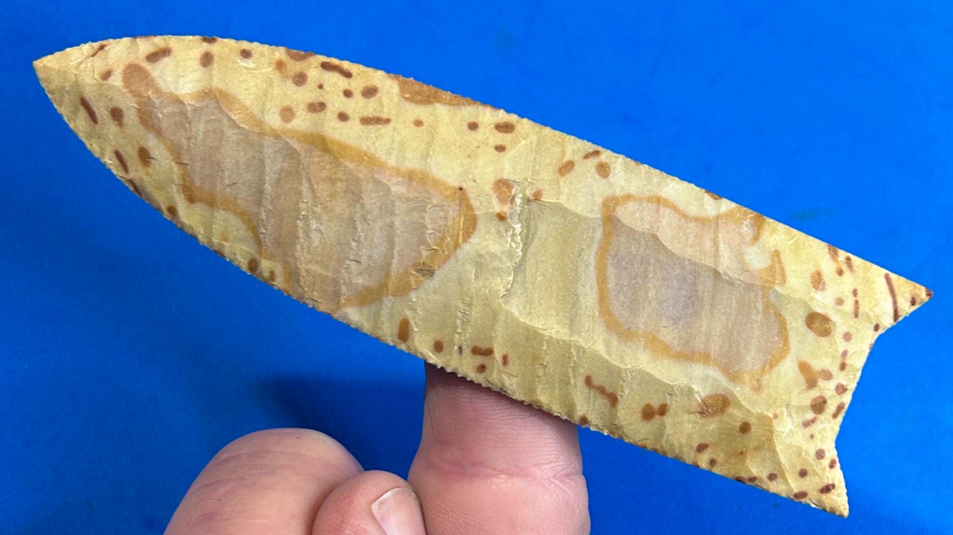 Here’s a 5″ Clovis point knapped from a hot piece of Painted Buffalo chert from Tennessee. It’s not often I find an appropriate piece of this material to squeeze out a 5″ Clovis, so this one has an extra cool factor!