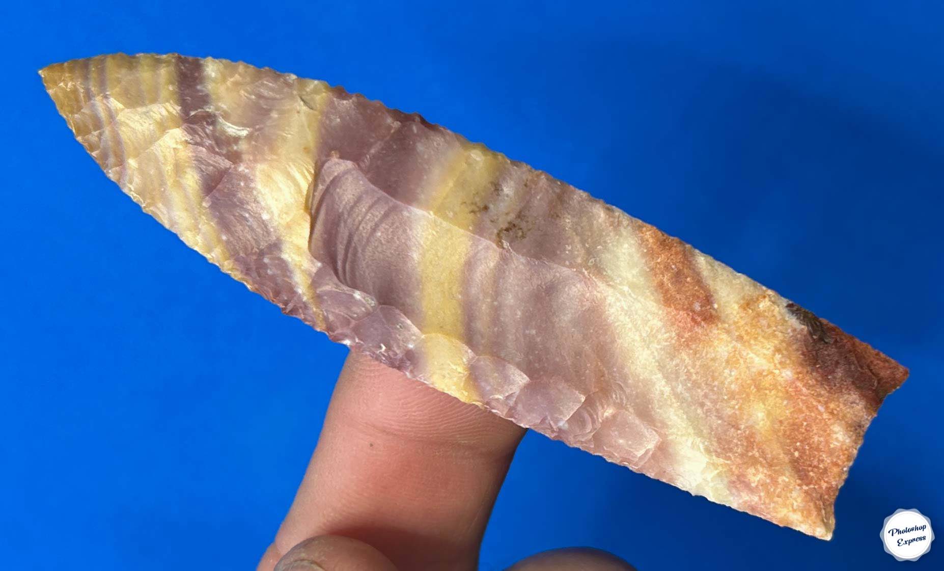 Polychrome Jasper and Clovis Points are two of my favorite things. That’s why this one has been hiding in my short term Keeper Case for a year or so.  The beautifully bodacious banding, and colors in this 3-5/8″ Clovis, will certainly be just as gorgeous residing in your Keeper Case.  Oh yeah, and it’s beautifully thin, too!
