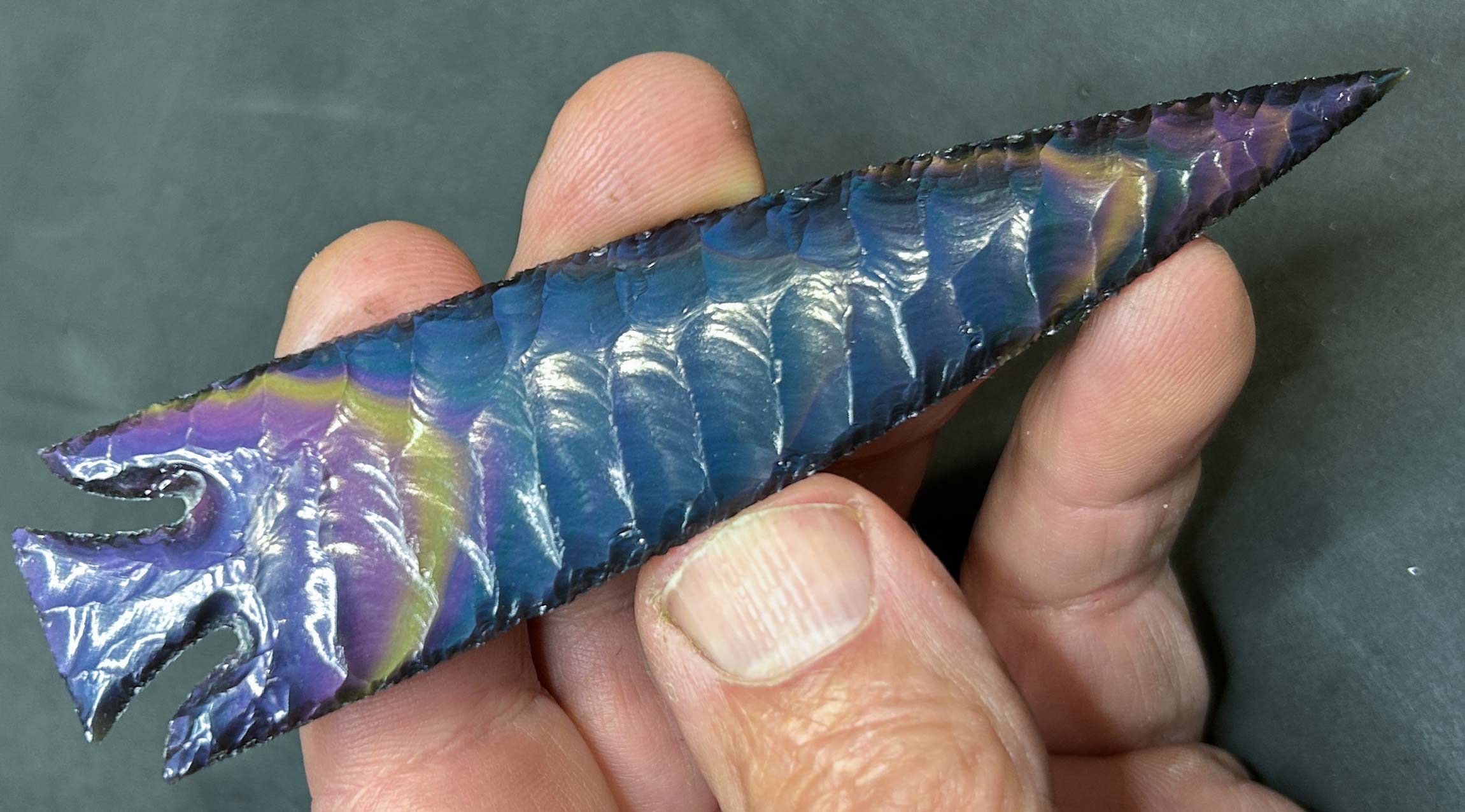 Rainbow Obsidian from Jalisco, Mexico can be a many splendor thing, and this 4.75″ narrow Hardin point is a unique example. I’ve never knapped a piece with the colors and pattern exactly like this one. It has beautiful bands of intense rainbow colors from tip to base on both sides! Jalisco Rainbow Obsidian doesn’t get any better than this!