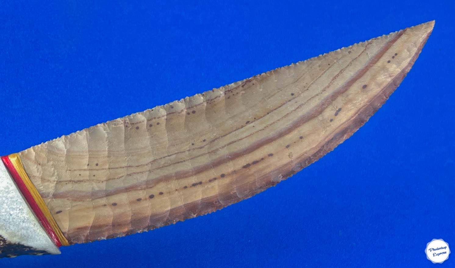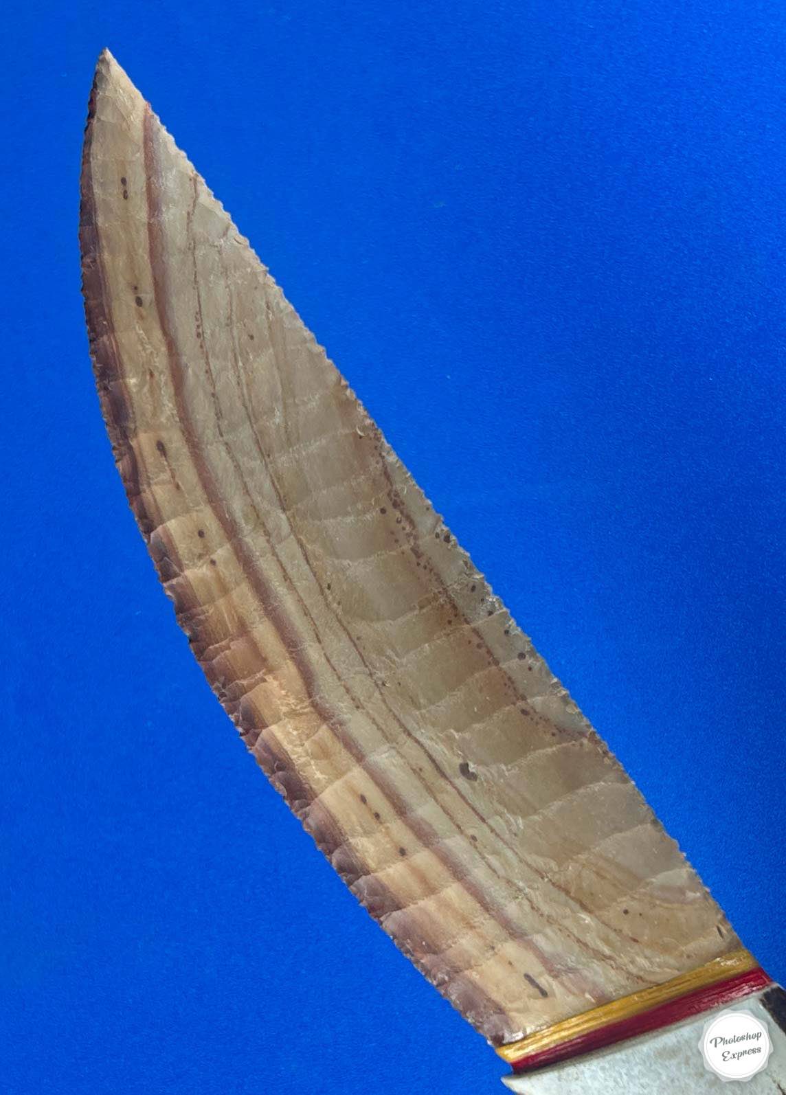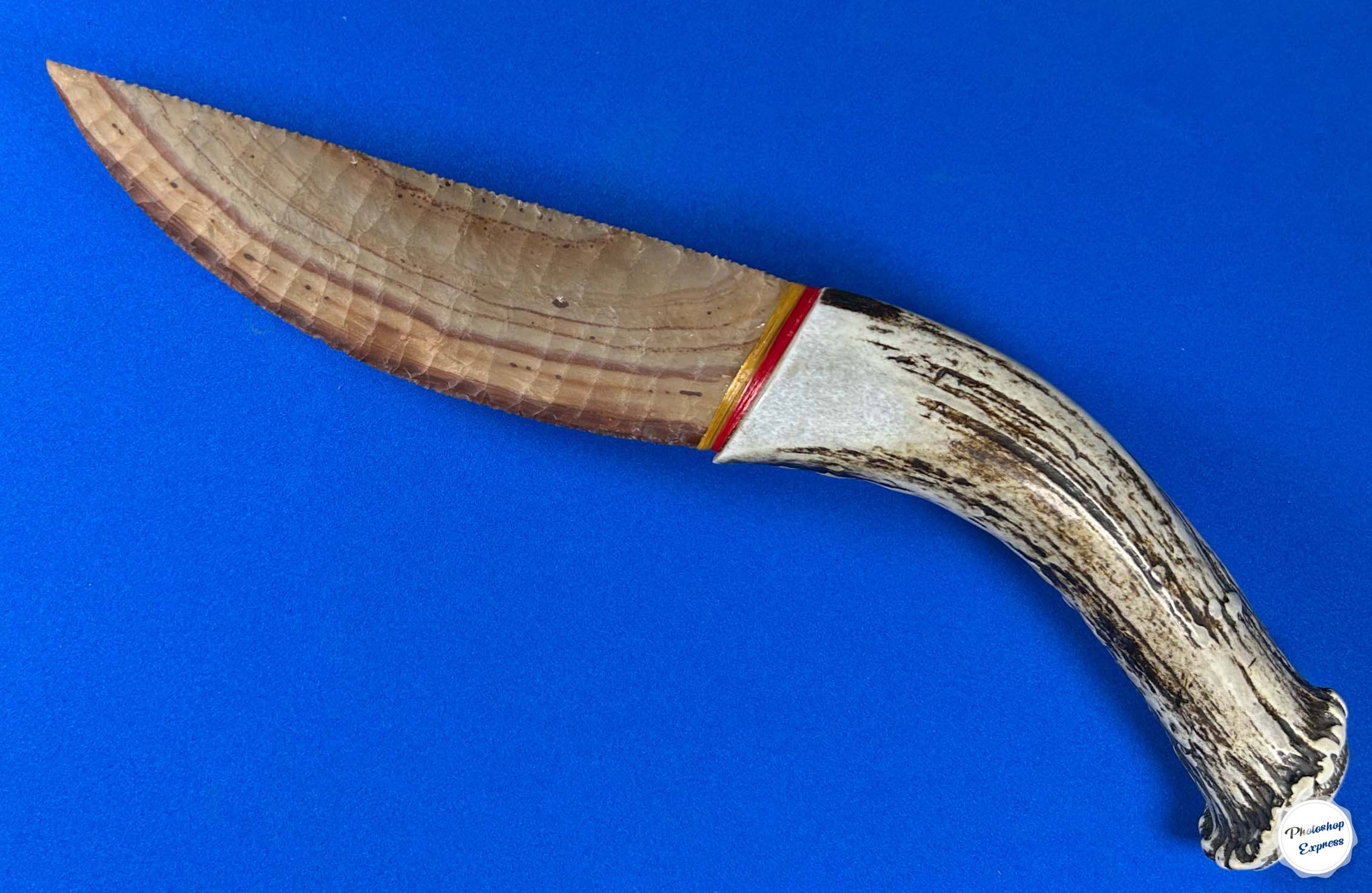 Buffalo River flint is a material I love when it has banding you see here, and this particular piece lends itself so well to the creation of a collectible knife. This design, that I call the Hunter, has smooth flowing lines and measures 11.5″ with a 6″ blade. I’ve been enjoying just looking at it for quite a while now, so the time has come for it to find a new fan!