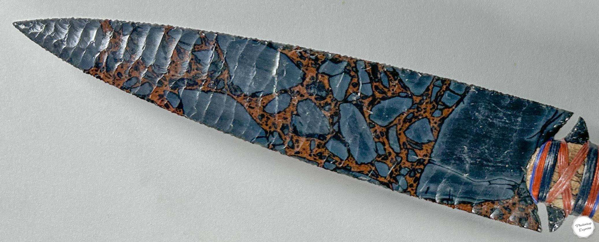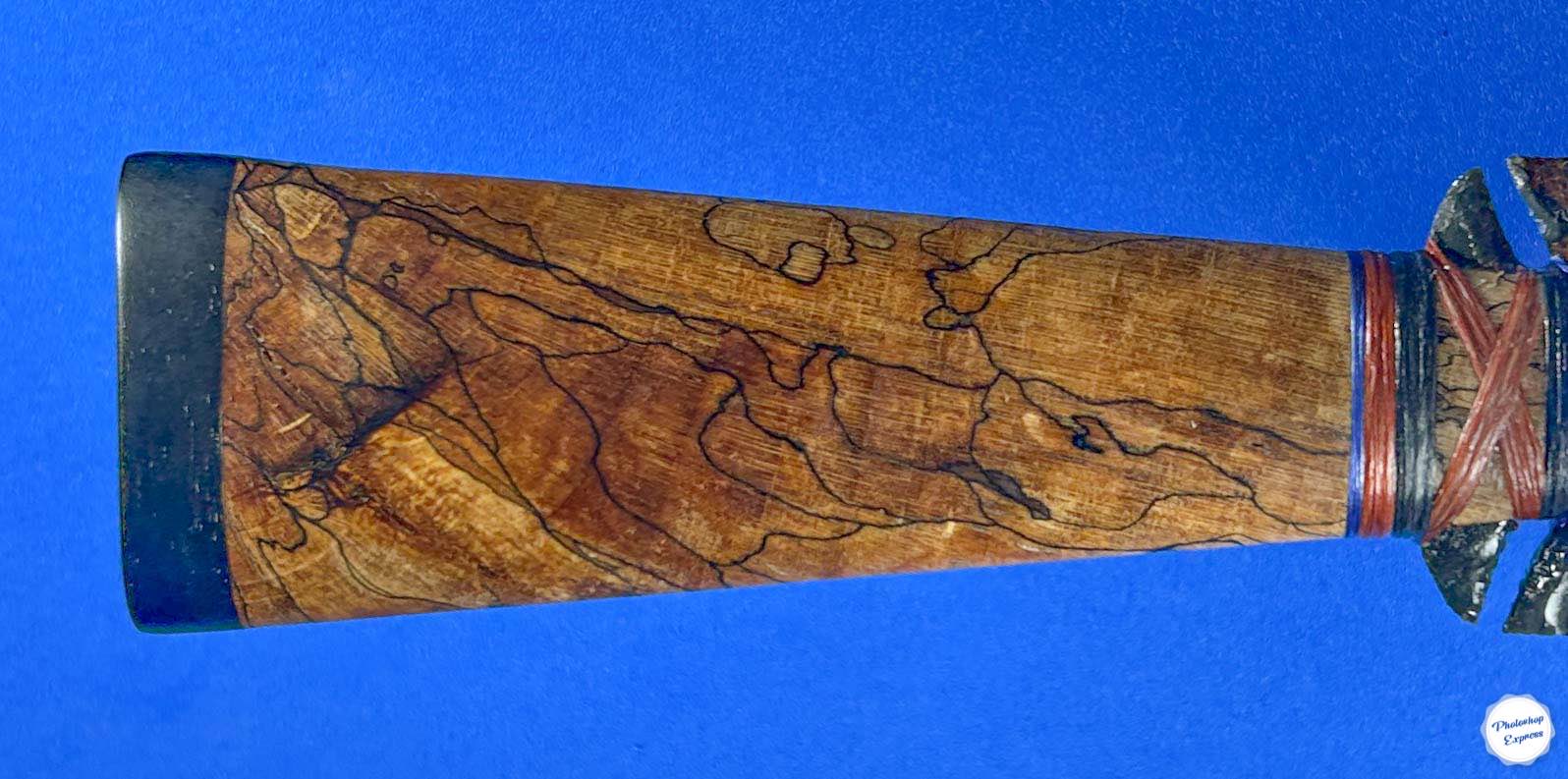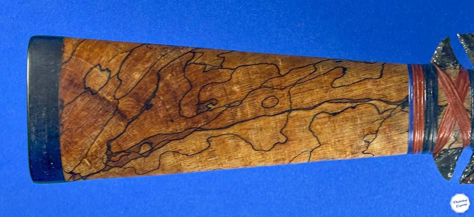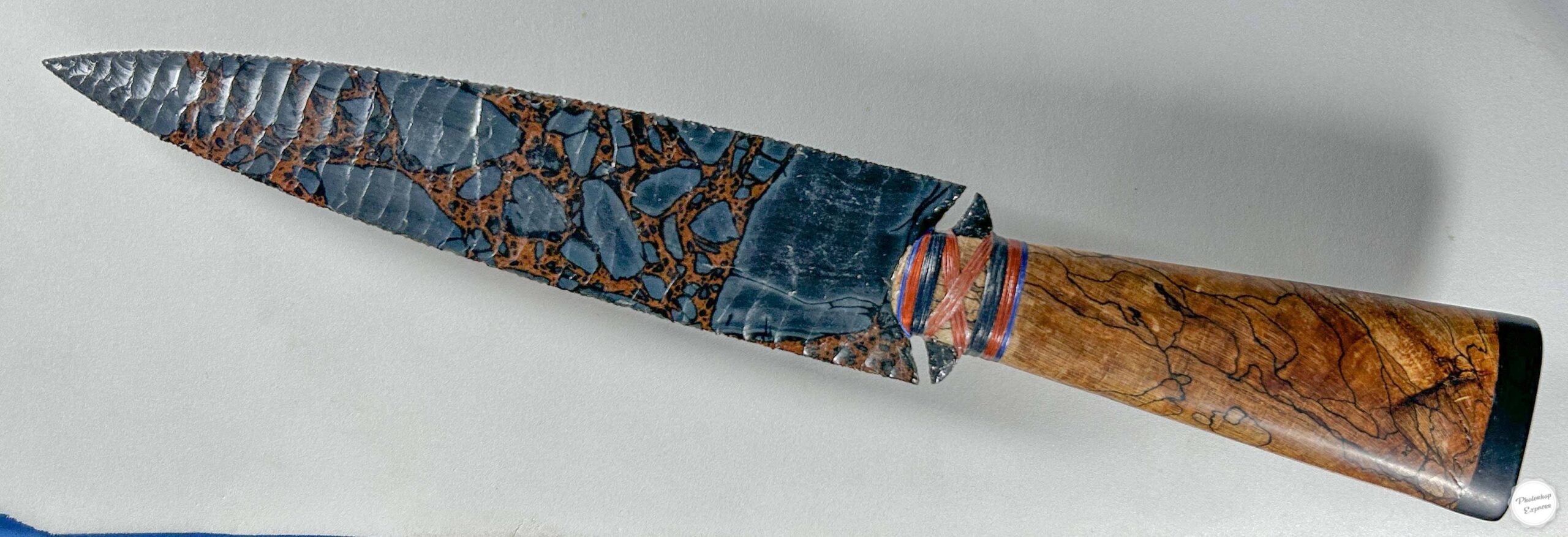 Here’s a showcase dagger made of select materials. The blade is knapped of highly patterned Dragonskin Obsidian from Armenia. When I finished it, I knew it needed to be matched up with a stabilized, spalted maple handle, the material harvested in my own woodlot. The pommel cap is ebony. Combined, it all came together as a 11.5″, streamlined dagger of unique beauty.