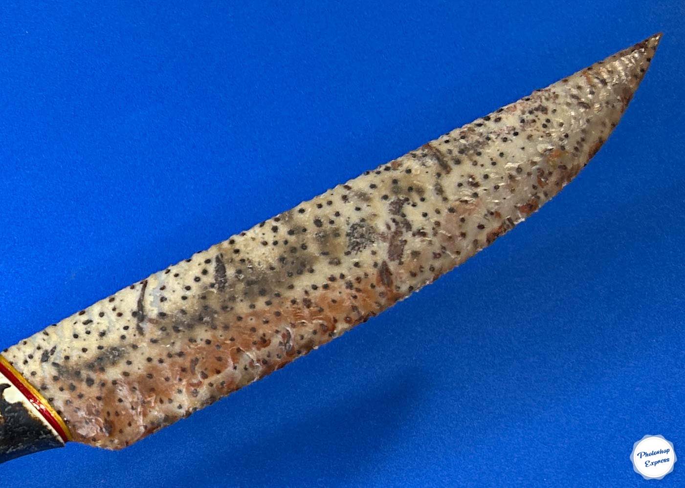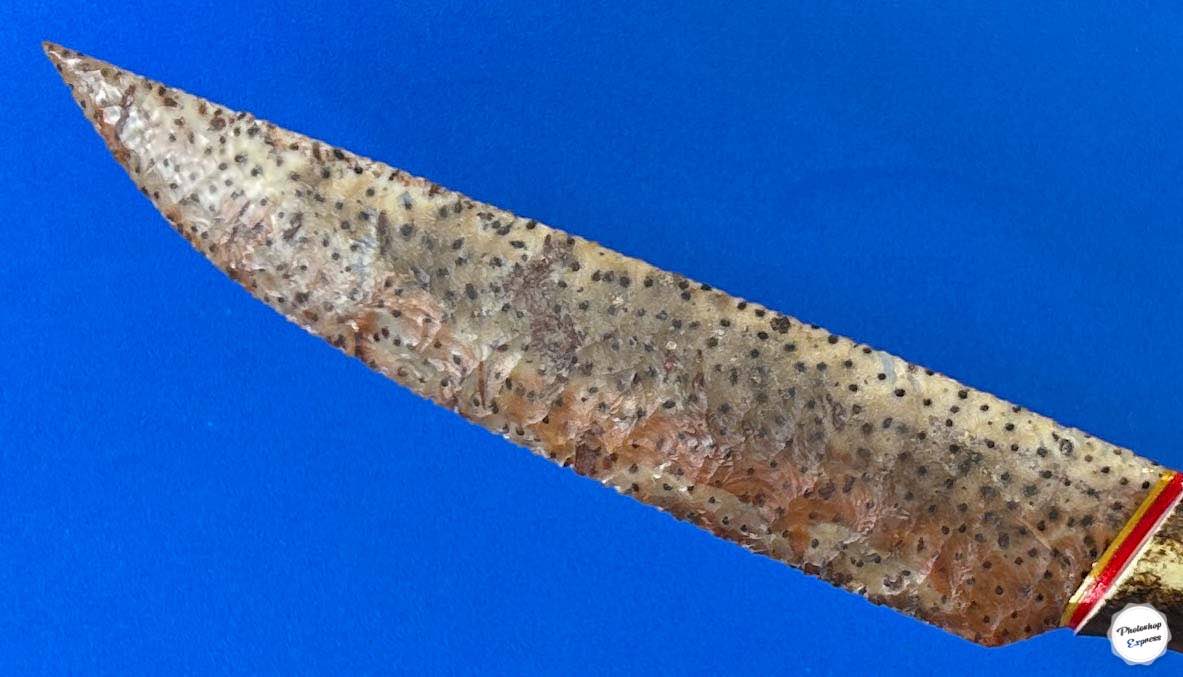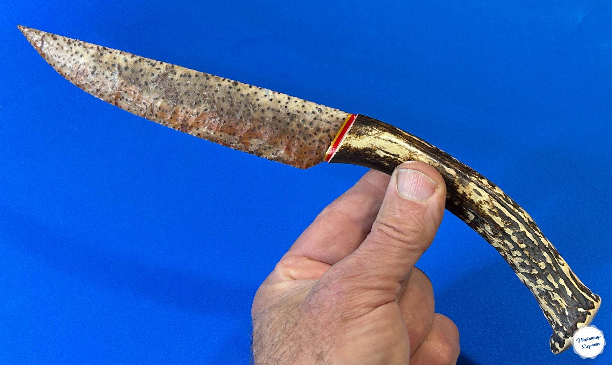This flintknapped knife was created from a unique piece of petrified palmwood. The colors and characteristic dot patterns of this material, from the tubules within a palm tree trunk, make it unique. The blade is set in a gracefully shaped whitetail deer antler that seemed perfect for it, resulting in a nicely balanced knife that is 11.25″ inches in length.